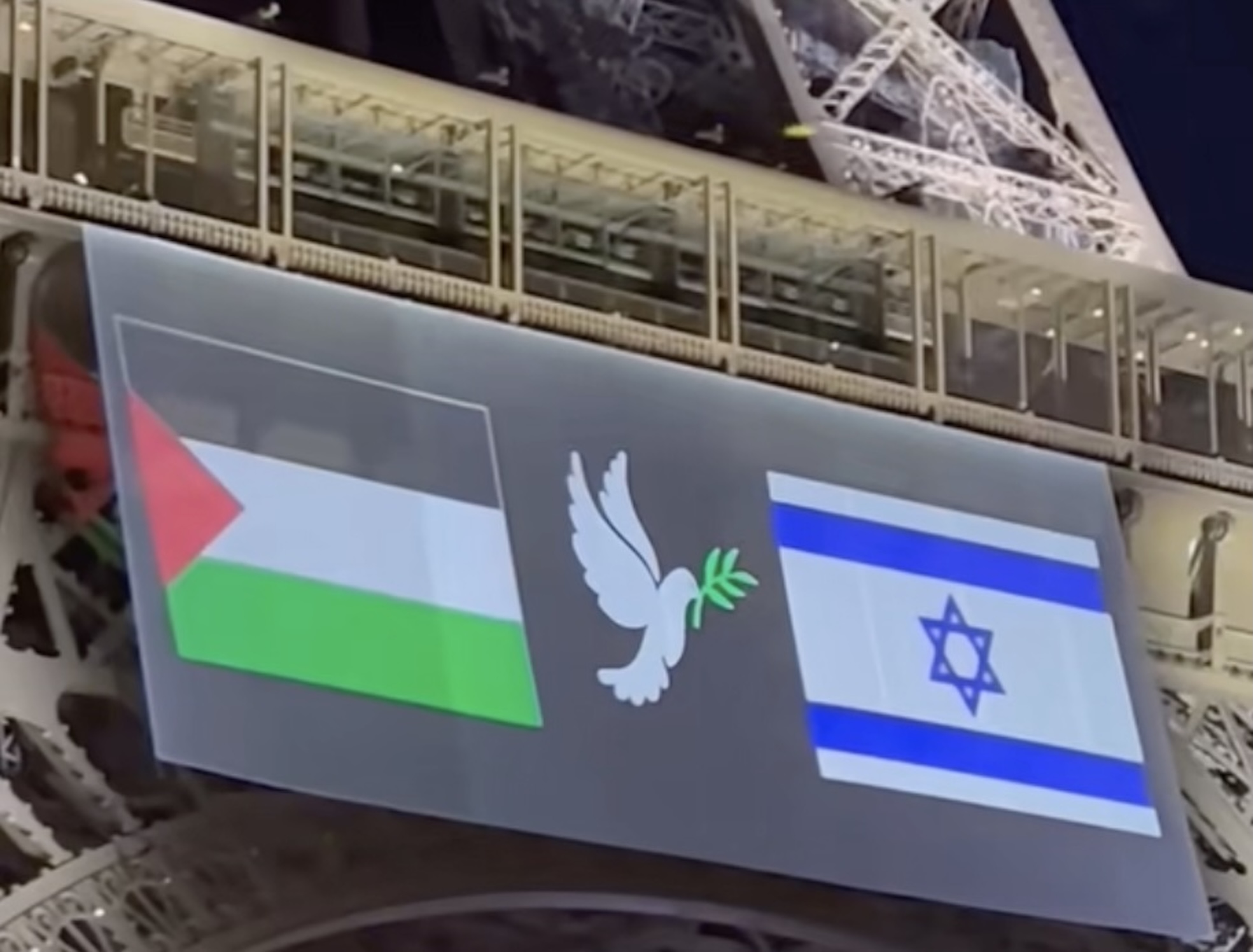 Ce pavoisement sur un grand écran, qui n'avait pas été annoncé, a commencé à 21H00 et doit se poursuivre jusqu'à 23H45, a indiqué à l'AFP la mairie de Paris, propriétaire du monument.