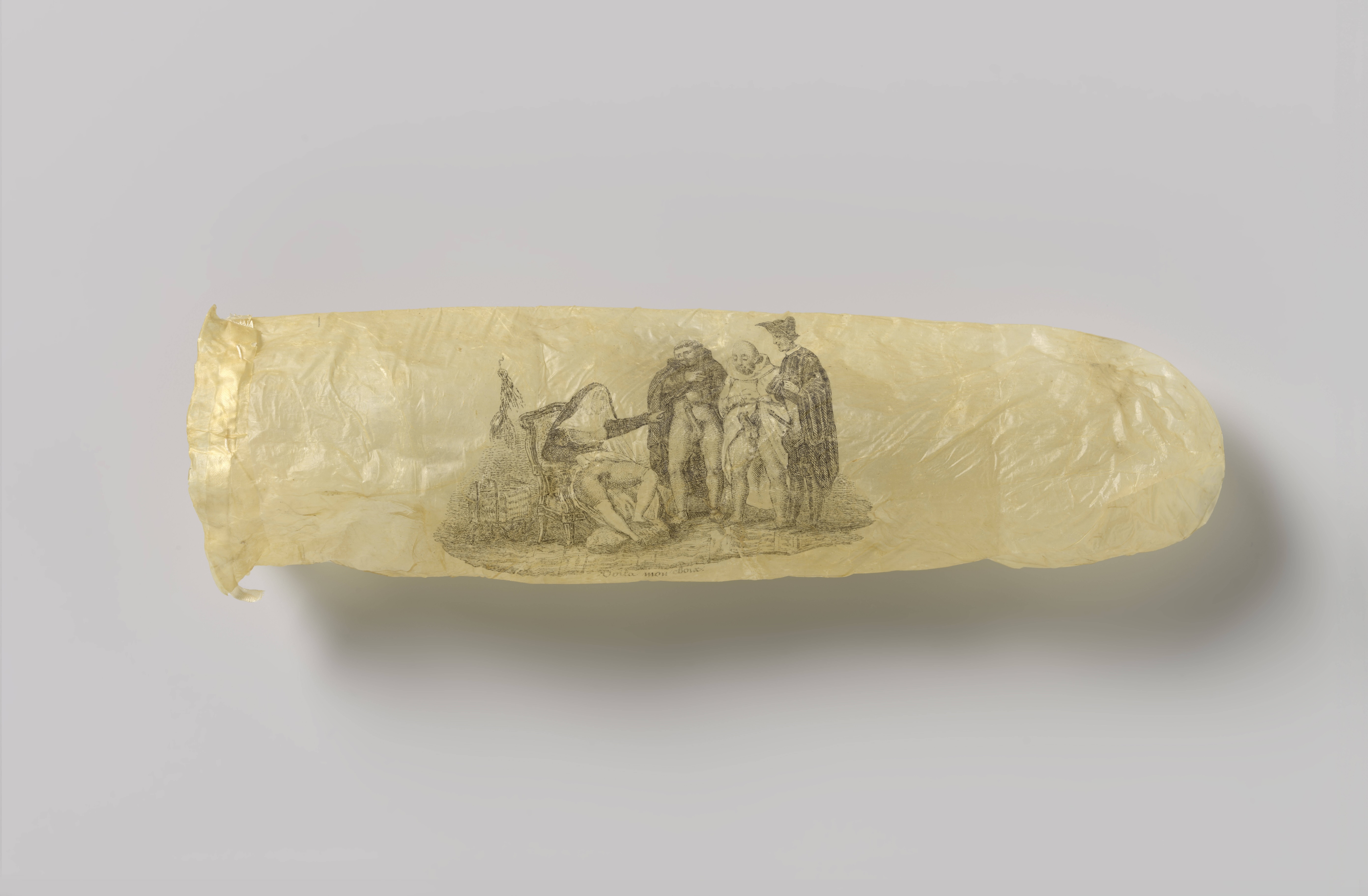 Ce préservatif se trouve au Rijksmuseum, à Amsterdam, capitale des Pays-Bas. Il date d'environ 1830 et est très rare. Il serait probablement fabriqué à partir d'un appendice de mouton, une petite excroissance du gros intestin, qui relie le côlon à l’intestin grêle.