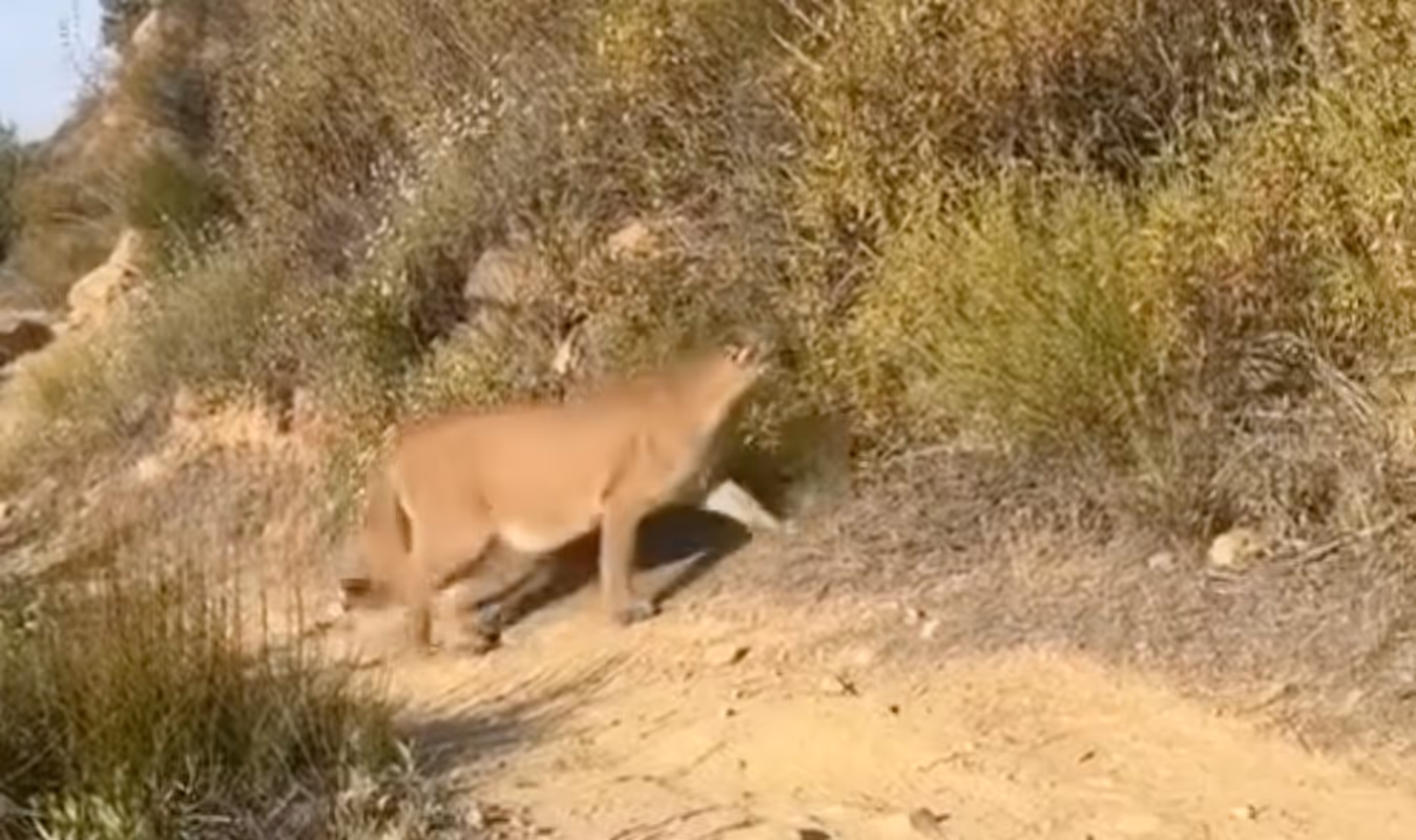 Le puma disparaît d'abord derrière un buisson avant de revenir sur le chemin de randonnée. Courtney Rasura poursuit avec la même technique et le félin décide finalement de s'enfuir, entraînant un "Merci. Oh mon Dieu" de la randonneuse.