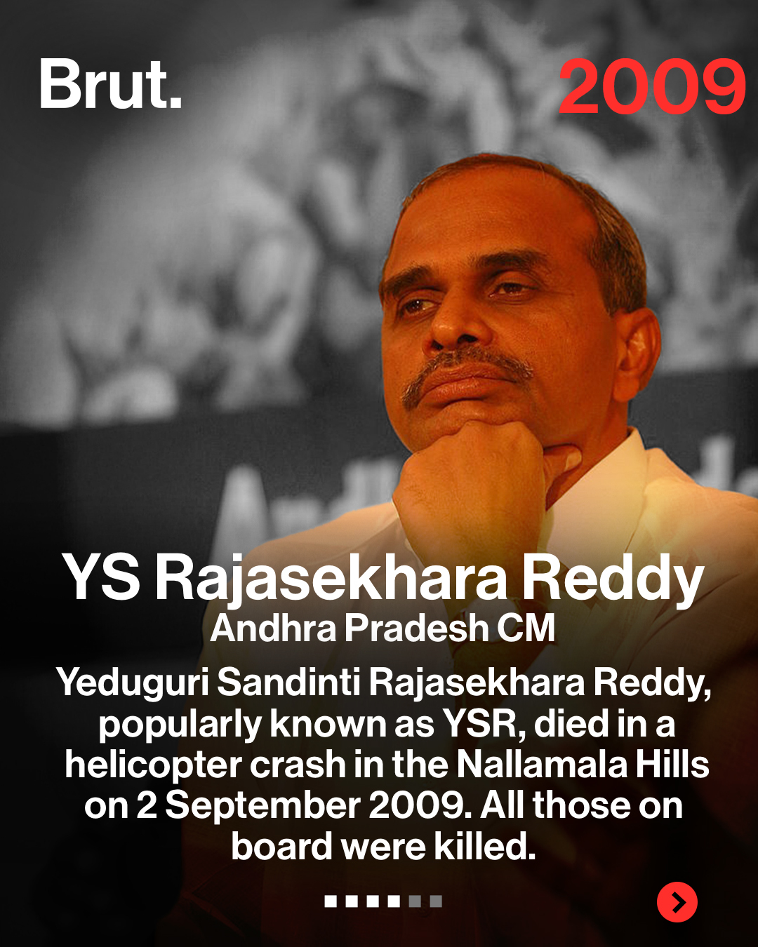 Yeduguri Sandinti Rajasekhara Reddy, the charismatic Chief Minister of Andhra Pradesh widely known as YSR, died in a helicopter crash on 2 September 2009. His Bell 430 helicopter went down in the dense Nallamala Hills during a period of inclement weather. The incident triggered a massive search operation before the wreckage was found. The death of YSR, who was a champion of welfare schemes, led to an unprecedented wave of public grief across the state.